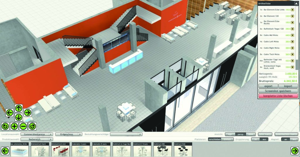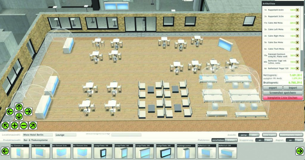 Mit direktem Zugriff auf unser gesamtes Eventequipment gestalten Sie die Räumlichkeiten nach Ihren Wünschen und behalten dabei immer den direkten Überblick über die Kosten. Nach Ihren Vorgaben bzgl. der Maße und der räumlichen Besonderheiten des Veranstaltungsorts erstellen wir eine interaktive Location im virtuellen Raum.